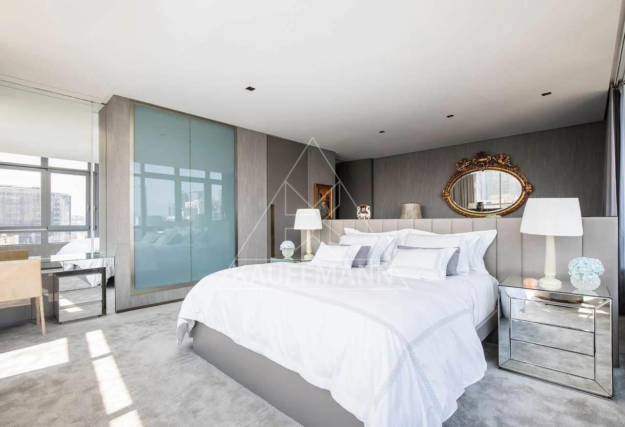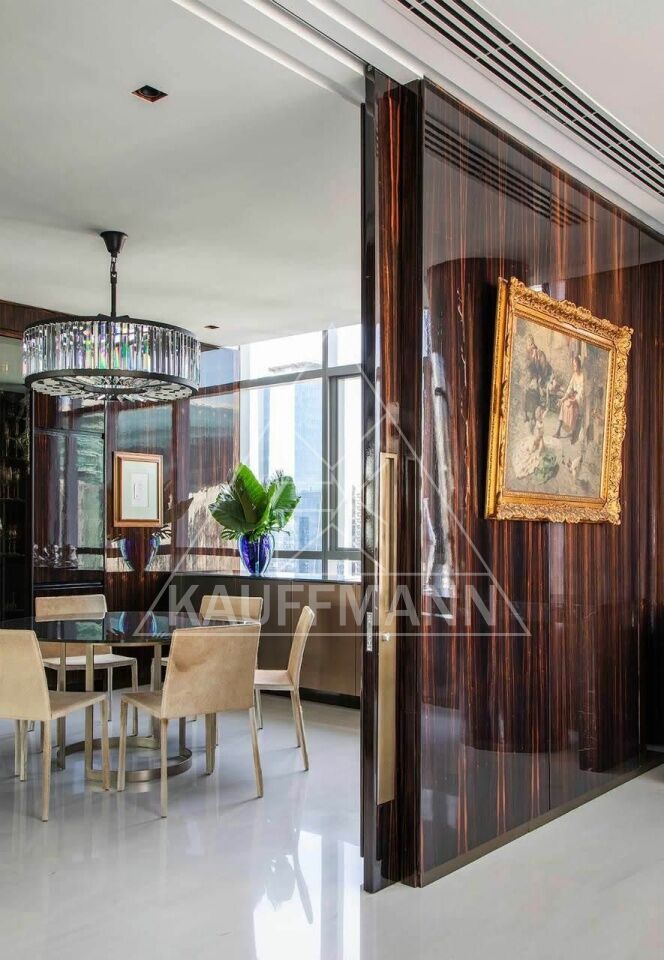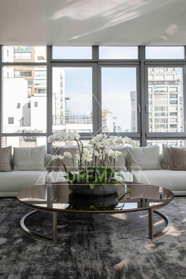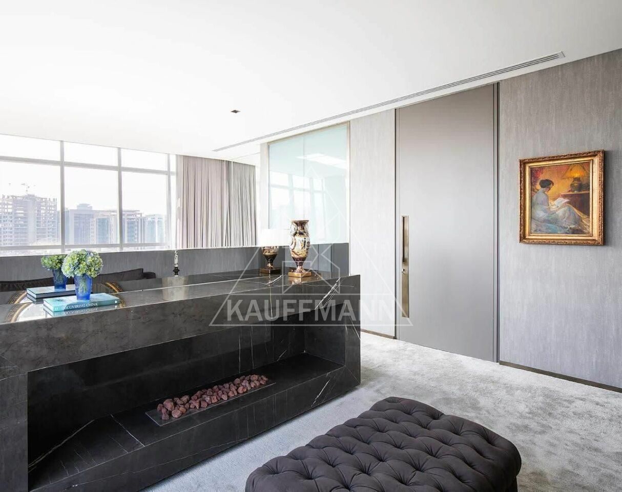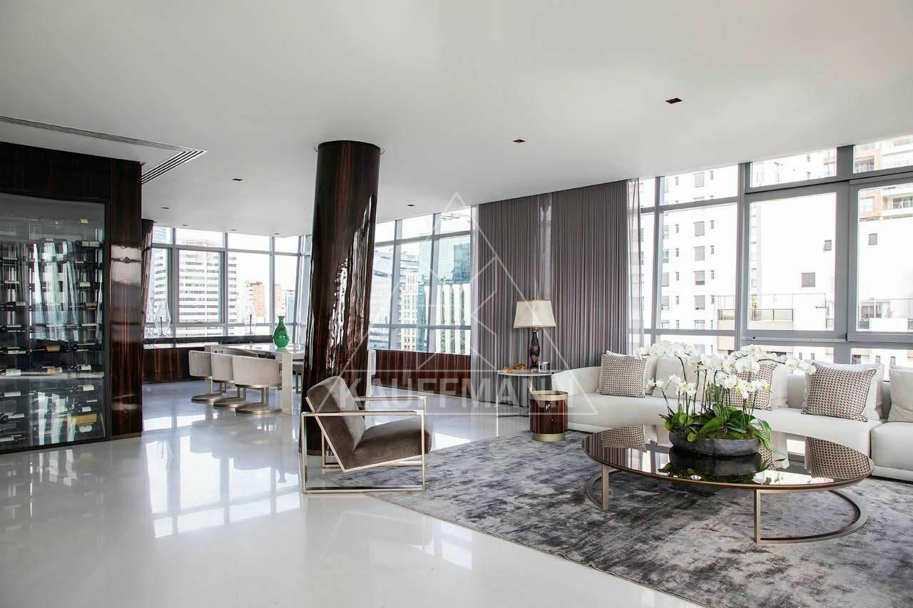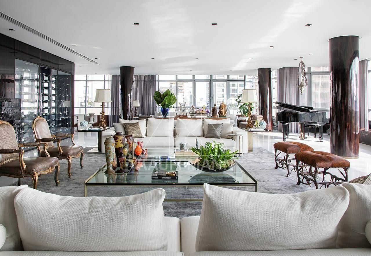 São três suítes amplas, living generoso com múltiplos ambientes integrados e excelente distribuição interna. O apartamento será vendido porteira fechada, permanecendo todos os móveis e itens, exceto obras de arte, pratarias e bens pessoais. Conta ainda com cinco vagas de garagem.