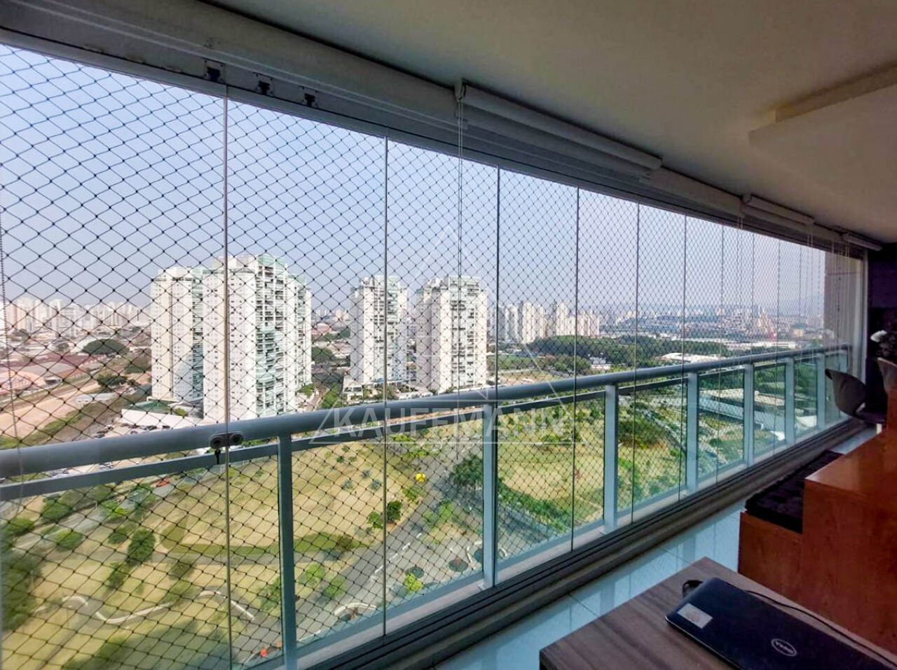 O apartamento conta com 2 suítes, ambas com closet e repletas de armários, além de um lavabo e uma prática lavanderia. A sala foi ampliada para dois ambientes e integra-se à varanda gourmet, já envidraçada e equipada com persianas rolô. O acabamento inclui piso em porcelanato nas áreas sociais e piso de madeira nos dormitórios. Ar condicionado já instalado em todo o apartamento, garantindo conforto durante todo o ano.