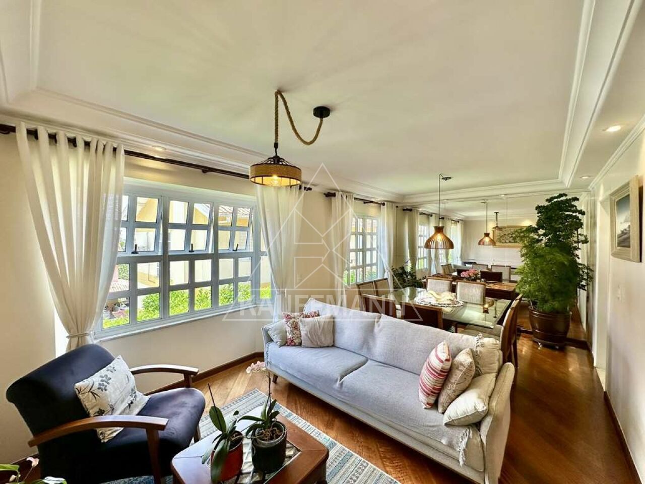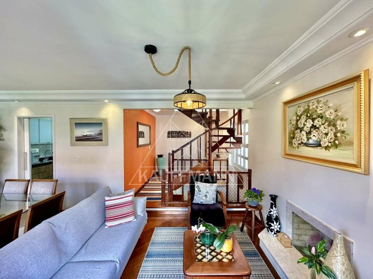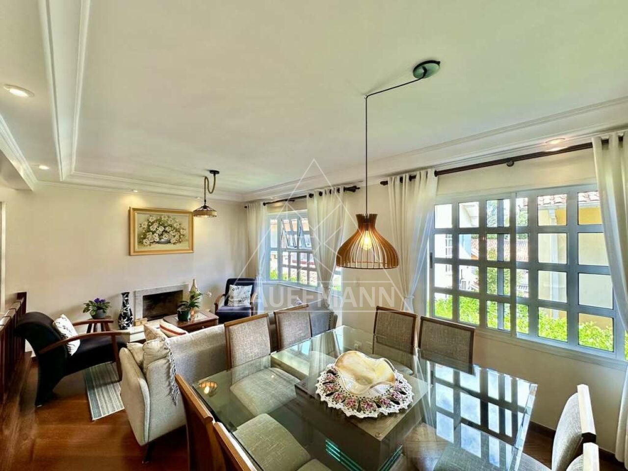 Sala ampla para 4 ambientes, incluindo estar, jantar, lareira e bar