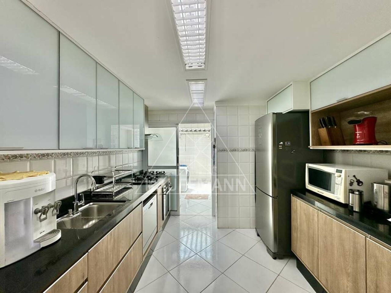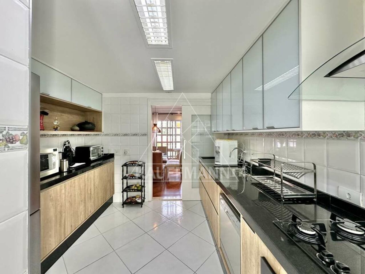 Cozinha integrada com armários planejados, bancadas em granito e eletrodomésticos embutidos