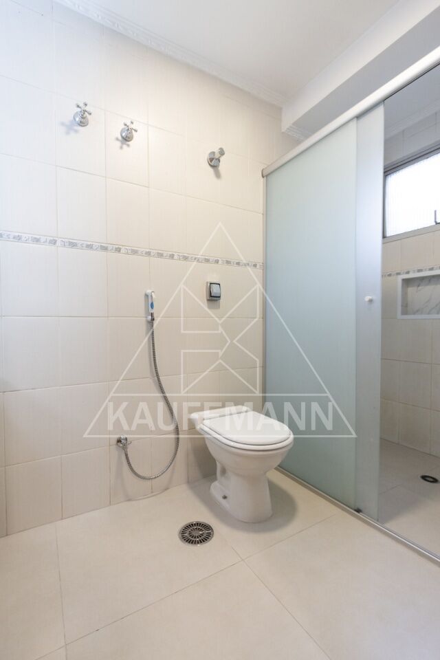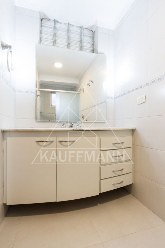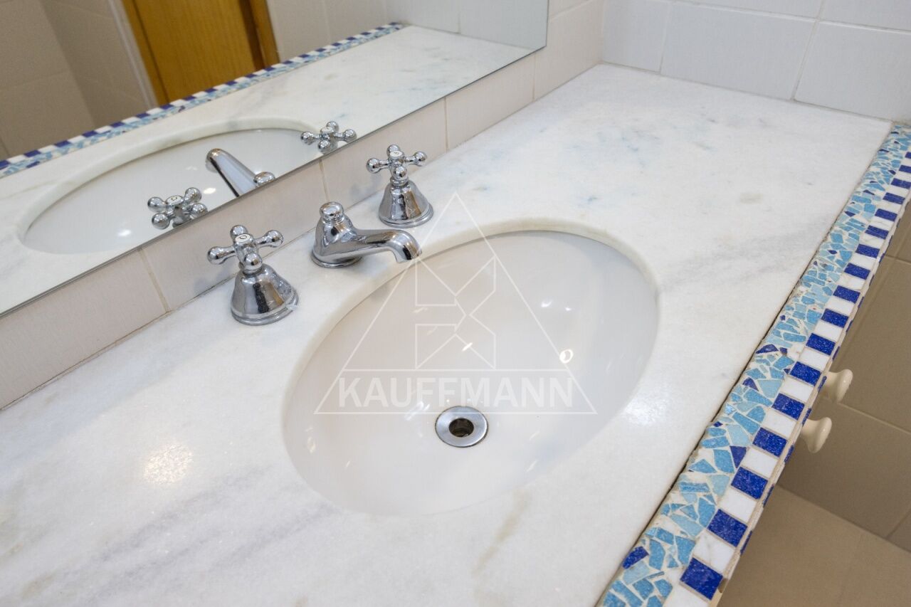 Banheiros equipados com box, armários e misturadores de água quente e fria.