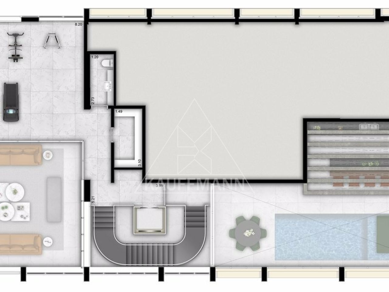 Sala: ampla, permitindo a configuração para áreas de estar, jantar e lazer