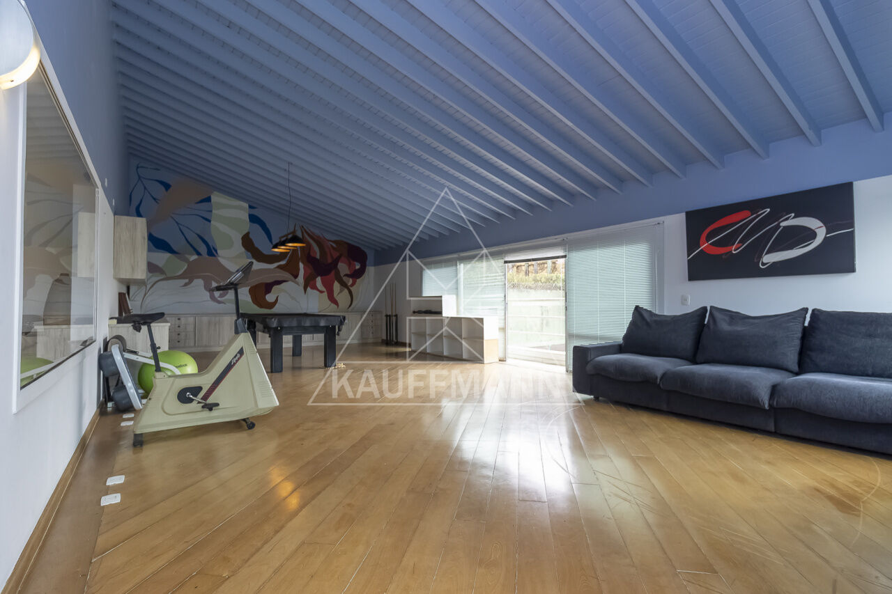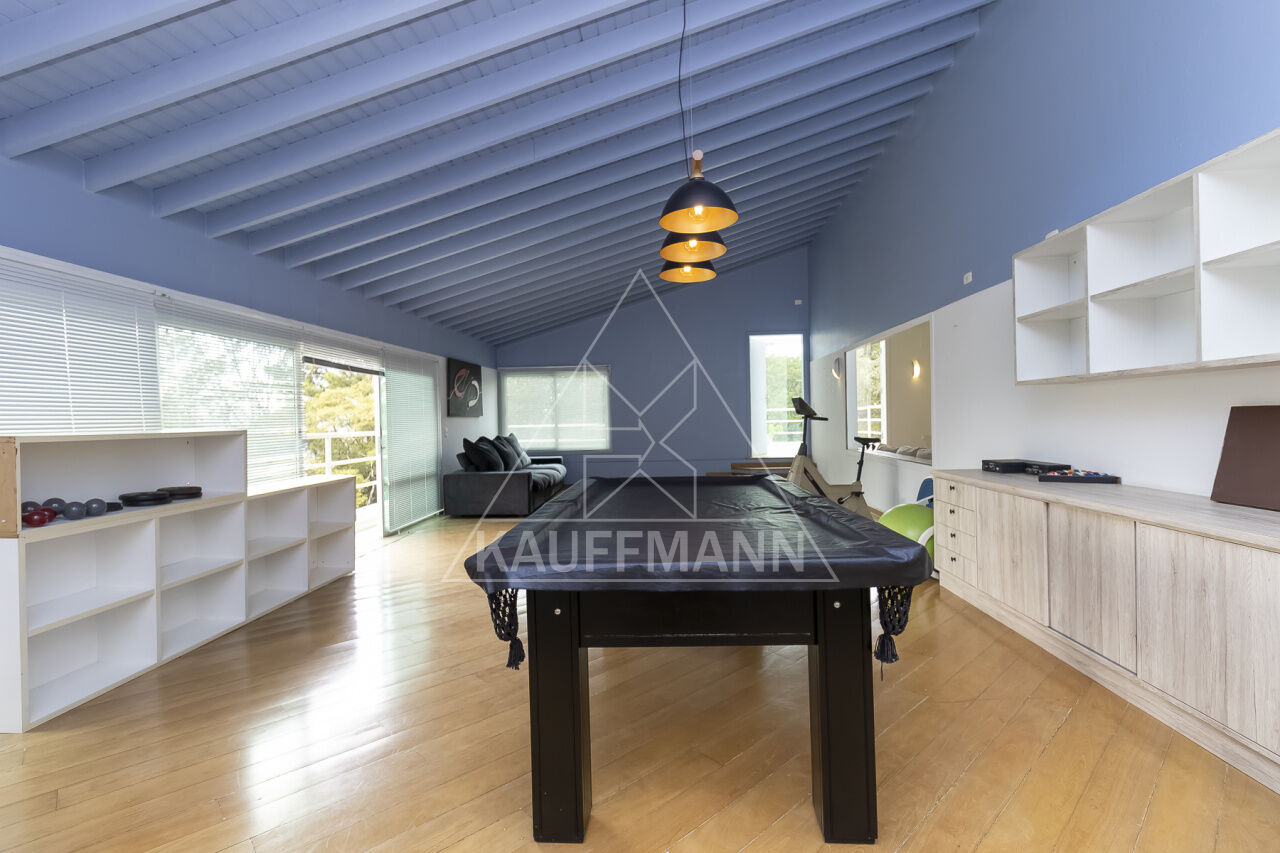 Sala de cinema e sala de ginástica com mesa de bilhar e varanda