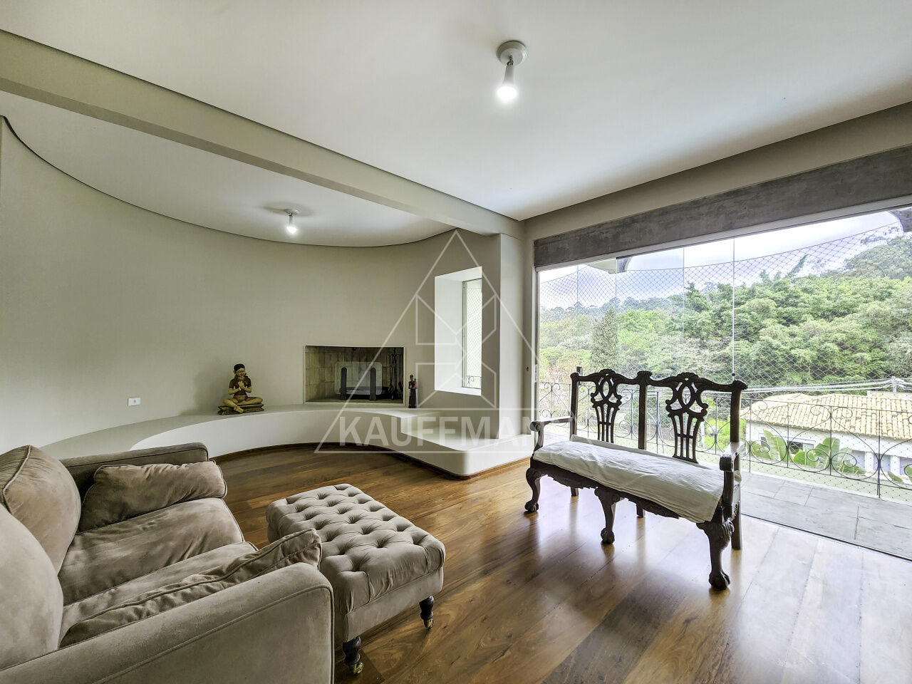 Living com lareira e vista para a área verde