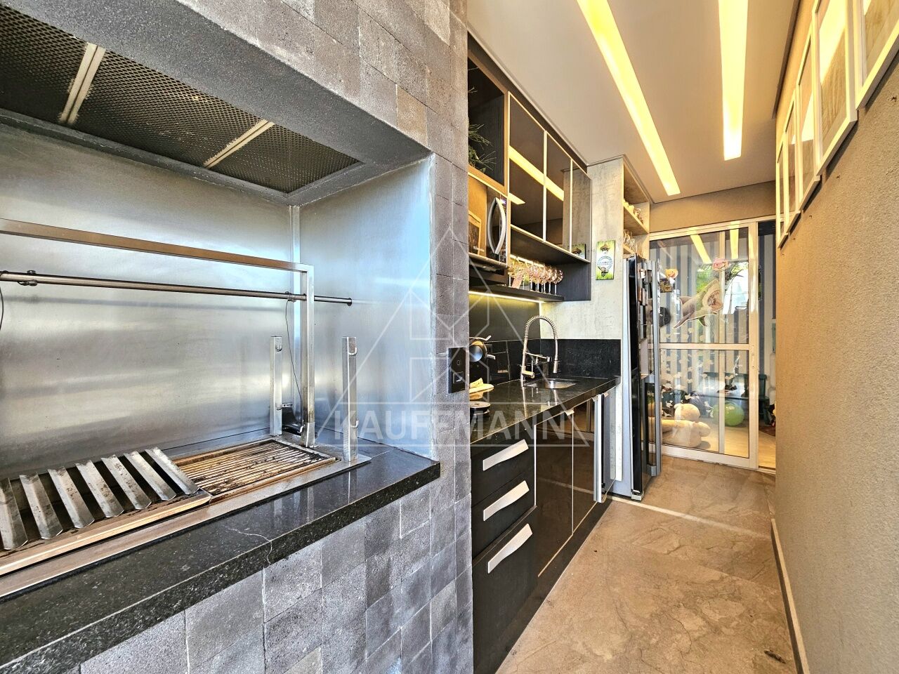 Varanda gourmet com churrasqueira a carvão e cozinha de apoio