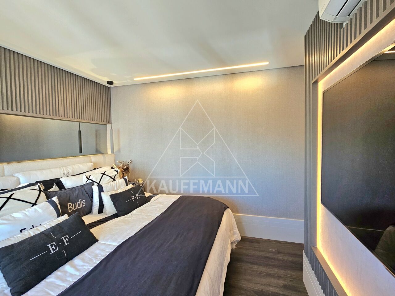 Suíte máster com closet ampliado e cabeceira personalizada