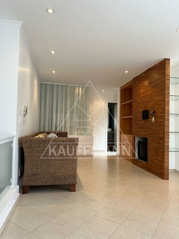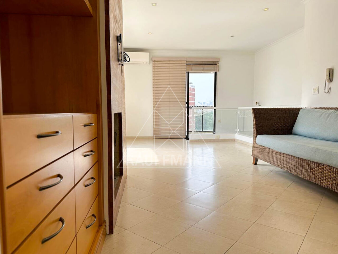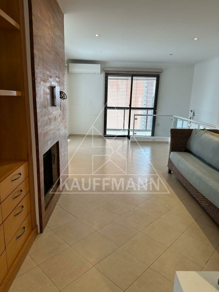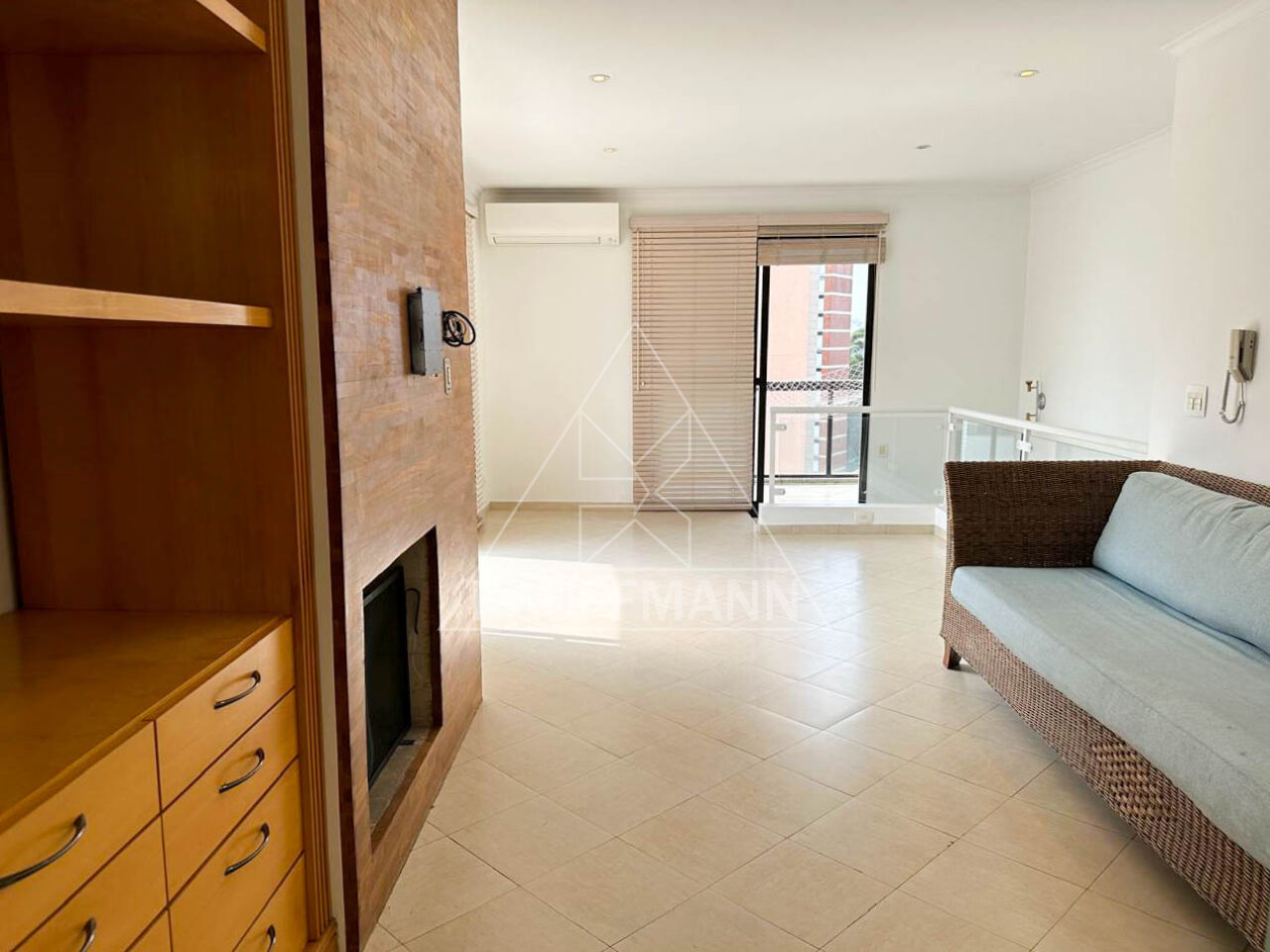 Sala superior em três ambientes, sofá para 6 pessoas, lareira, sacada lateral com vista para o Parque Ibirapuera.