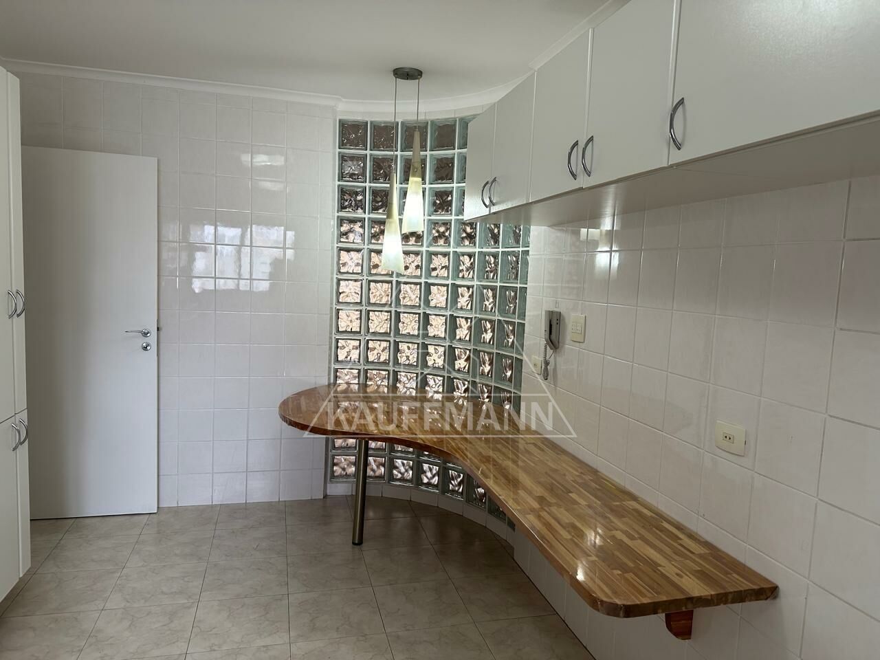 Cozinha bem espaçosa, com mesa-balcão de madeira maciça para 5 pessoas sentadas.