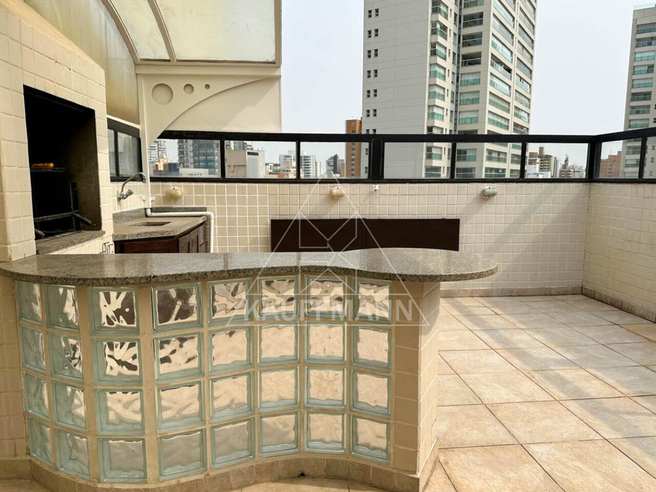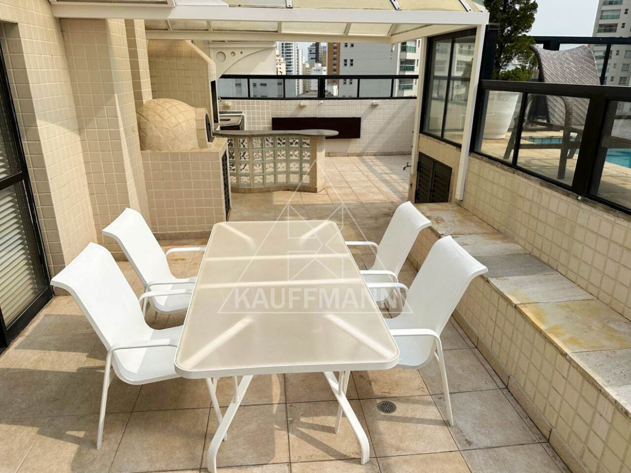 Área de lazer da cobertura com piscina, churrasqueira, pia com armário, forno de pizza, mesa ampla, balcão para servir e vista panorâmica aberta para área nobre do bairro.